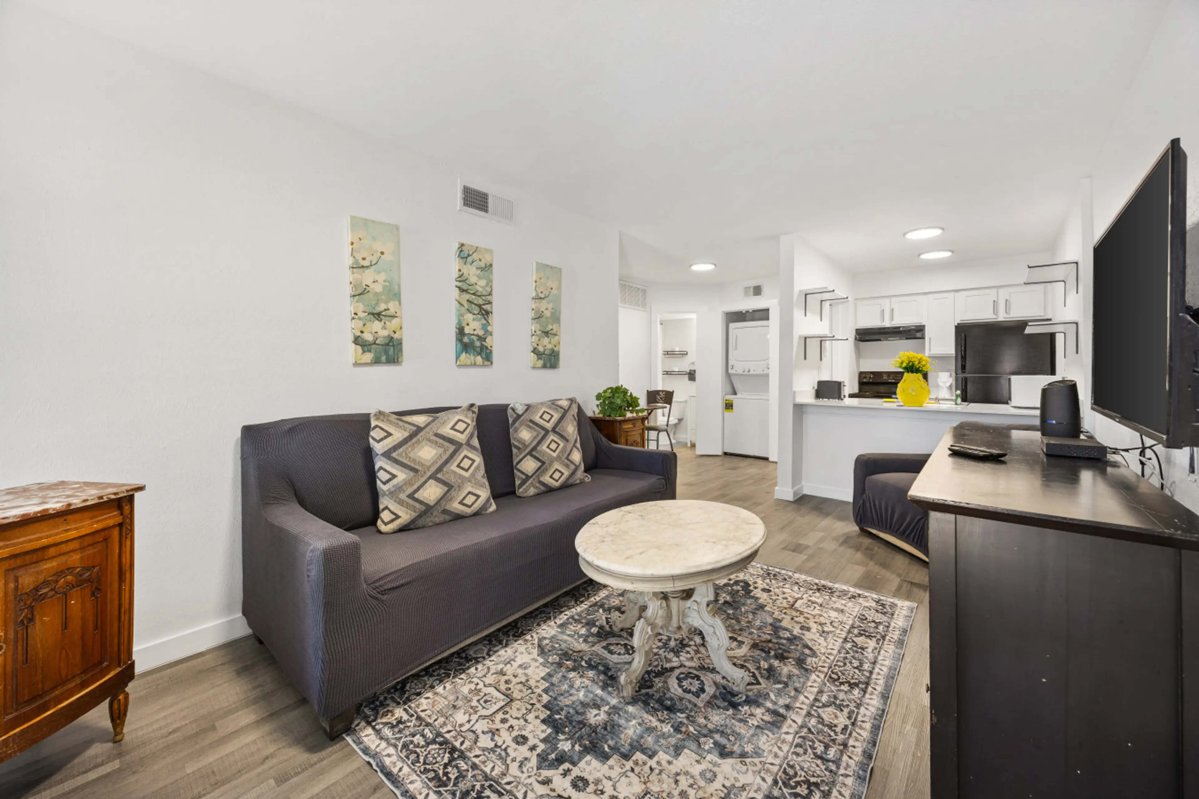 RENOVATED ADDITIONS! Cozy 1 bedroom apartment with balcony!! Fully equipped and self contained. Washer & dryer in the unit. Balcony. 55” smart TV! Free WIFI & Cable! Seasonal pool! Close access to the fwy! $150 Pet Fee Per Pet Parking is first come first serve. A parking pass is provided. Perfec...
