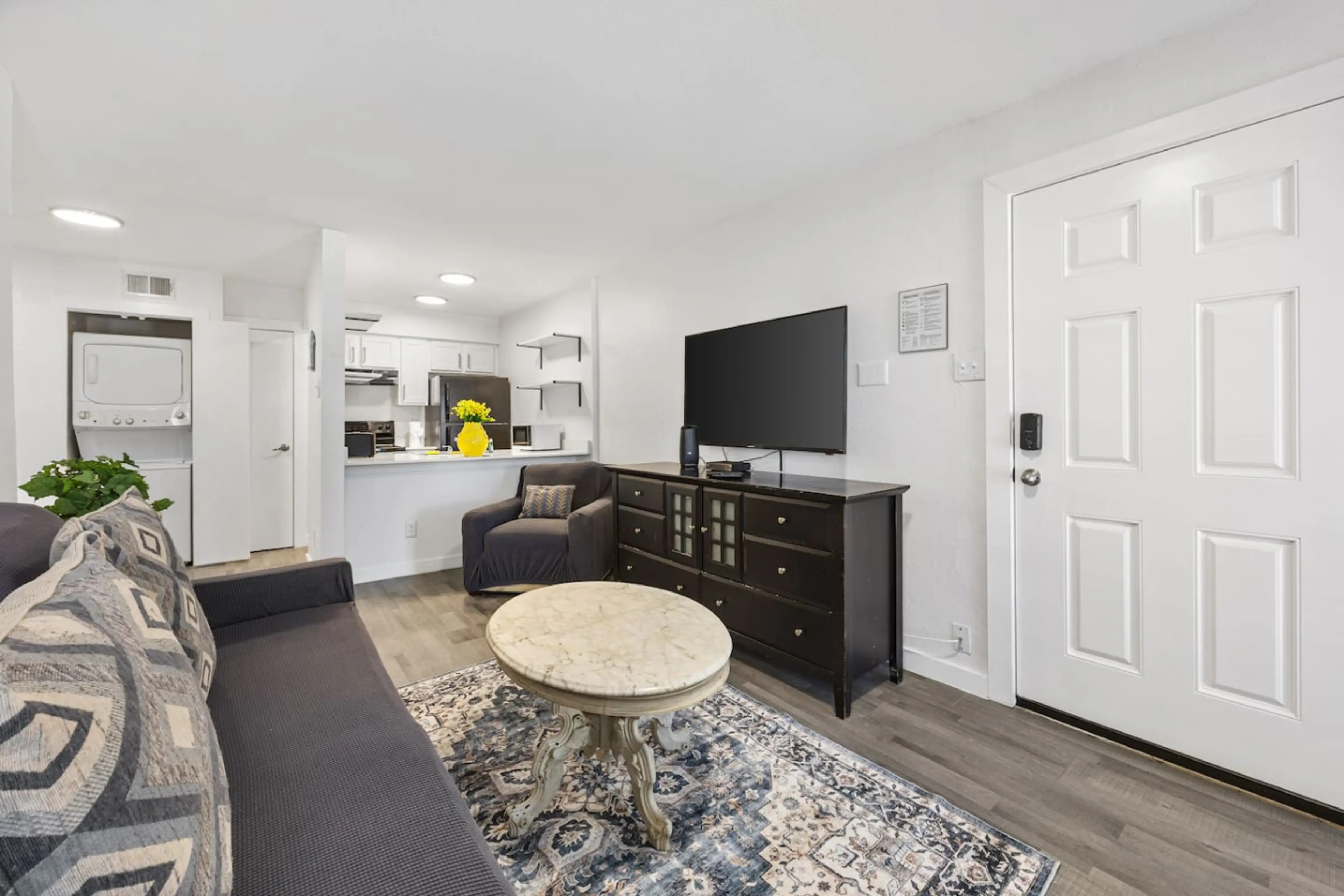 New renovated Kitchen! Cozy 1 bedroom apartment with balcony!! Fully equipped and self contained. Washer & dryer in the unit. Balcony. 55” smart TV! Free WIFI & Cable! Seasonal pool! Close access to the fwy! $150 Pet Fee Per Pet Parking is first come first serve. A parking pass is provided. Perf...